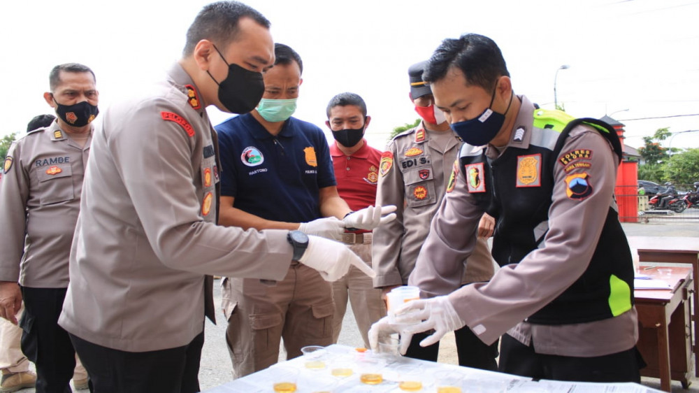 "Jadi dalam tes urine ini kita gunakan tes kit narkoba, di mana bisa langsung diketahui hasilnya. Namun demikian jika ditemukan anggota yang terindikasi positif, akan kita kirimkan hasil tes urinenya ke Laboratorium Forensik untuk periksa lebih lanjut," kata Kasat Resnarkoba.