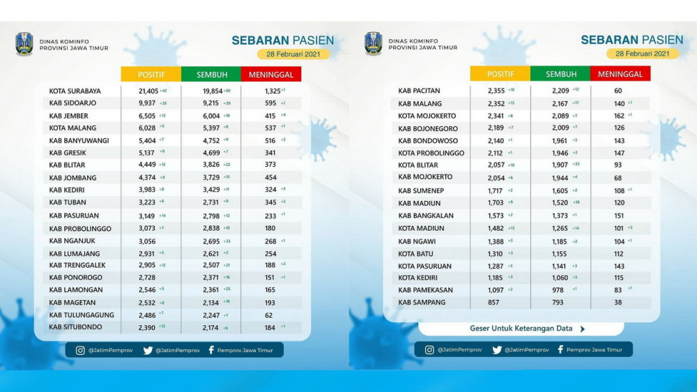 Infografis Data Sebaran Pasien COVID-19 Provinsi Jawa Timur. Minggu (28/02/2021)