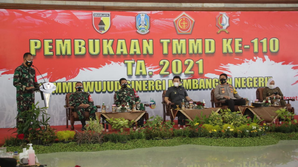 Bojonegoro - Wakil Gubernur Jawa Timur, Emil Elestianto Dardak, didampingi Pangdam V Brawijaya, Mayjend TNI Suharyanto dan Kapolda Jawa Timur, Irjen Pol Nico Afinta, pada Selasa (02/03/2021), resmikan pembukaan TNI Manunggal Membangun Desa (TMMD) ke-110, tahun 2021, di Pendopo Malowopati, Pemkab Bojonegoro.