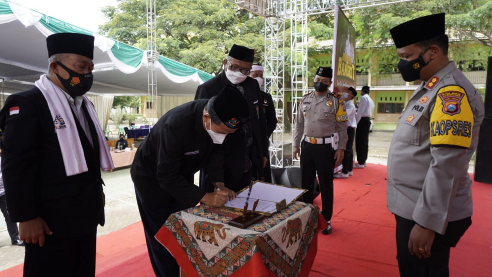 Penandatanganan kesepakatan bersama dai dan pendeta Kamtibmas dengan Polres Bojonegoro, dalam acara Sarasehan Dai Kamtibmas. Kamis (04/03/2021) (foto: istimewa)