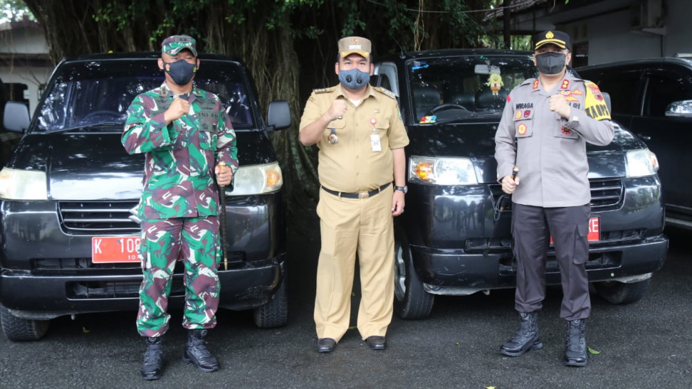 Bupati Blora, H Arief Rohman, bersama Dandim dan Kapolres Blora, saat serahkan 16 unit mobil untuk operasional Koramil di jajaran Kodim 0721 Blora. Senin (08/03/2021). (foto: istimewa)
