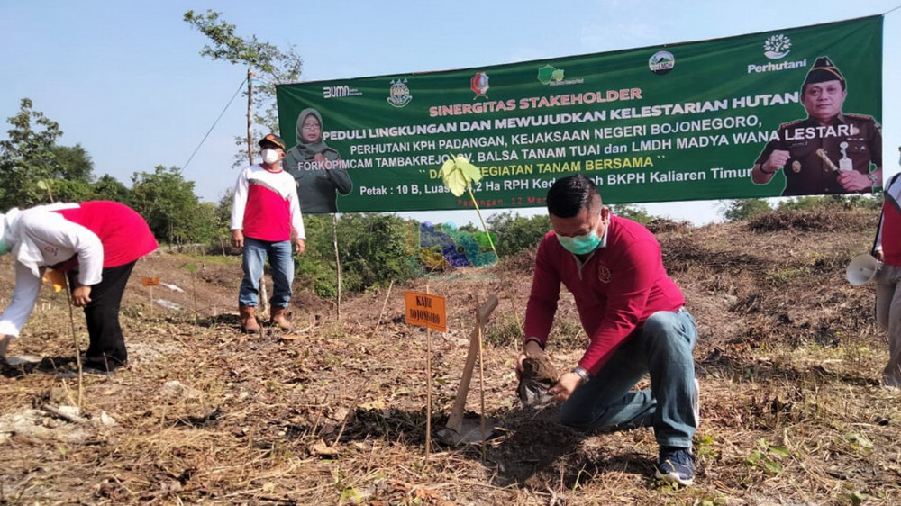 Bojonegoro - Kejaksaan Negeri (Kejari) Bojonegoro, pada Jumat (12/03/2021), kembali menggelar acara "Jaksa Masuk Hutan", yang dirangkai dengan penanaman pohon bersama Perhutani KPH Padangan di Petak 84C RPH Kaliaren, BKPH Kaliaren Barat, turut Desa Malingmati, Kecamatan Tambakrejo, Kabupaten Bojonegoro.