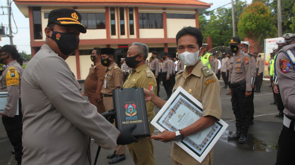 Penghargaan tersebut diserahkan langsung Kapolres Bojonegoro, AKBP EG Pandia, dalam apel pagi di halaman Mapolres Bojonegoro, sebagai apresiasi Polres Bojonegoro kepada Kades, Kasun dan Ketua RT yang sudah mendirikan Posko PPKM Mikro dan telah difungsikan sebagai mana mestinya dalam menangani COVID-19, sehingga dapat memotivasi desa yang lain