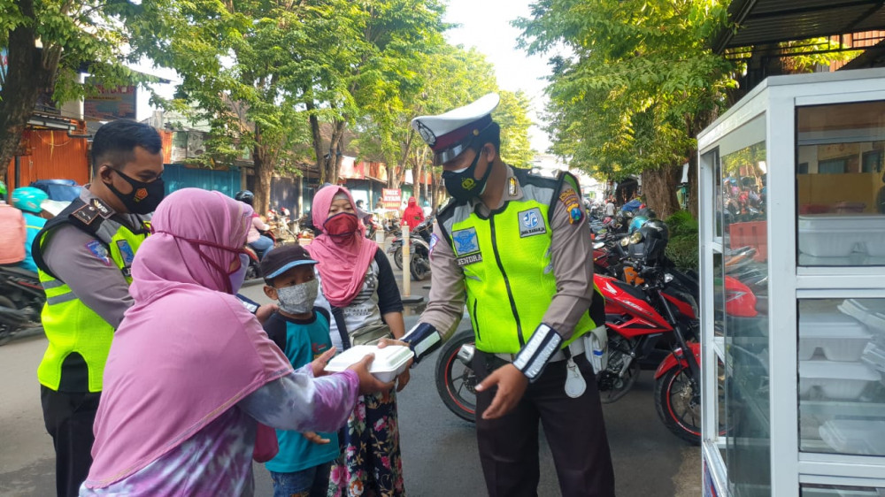 Bojonegoro - Jajaran Satuan Lalu Lintas (Sat Lantas) Polres Bojonegoro, pada Jumat (19/03/2021) kembali menlaksanakan kegiatan sosial, berbagi ratusan nasi bungkus gratis untuk warga masyarakat kurang mampu.