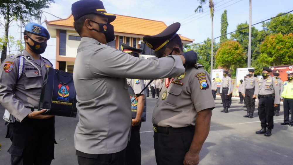 Secara simbolis Kapolres Bojonegoro menyerahkan tanda penghargaan serta mengalungkan medali kepada personel yang mengakhiri masa bhaktinya tersebut.