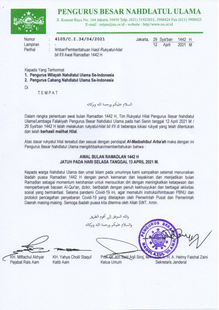 Atas dasar rukyatul hilal tersebut dan sesuai dengan pendapat Al-Hadzahibul Arba'ah, maka dengan ini Pengurus Besar Nahdlatul Ulama (PBNU) meng-ikhbar-kan atau memberitahukan bahwa awal bulan Ramadan 1442 Hijriyah jatuh pada hari Selasa, tanggal 13 April 2021.