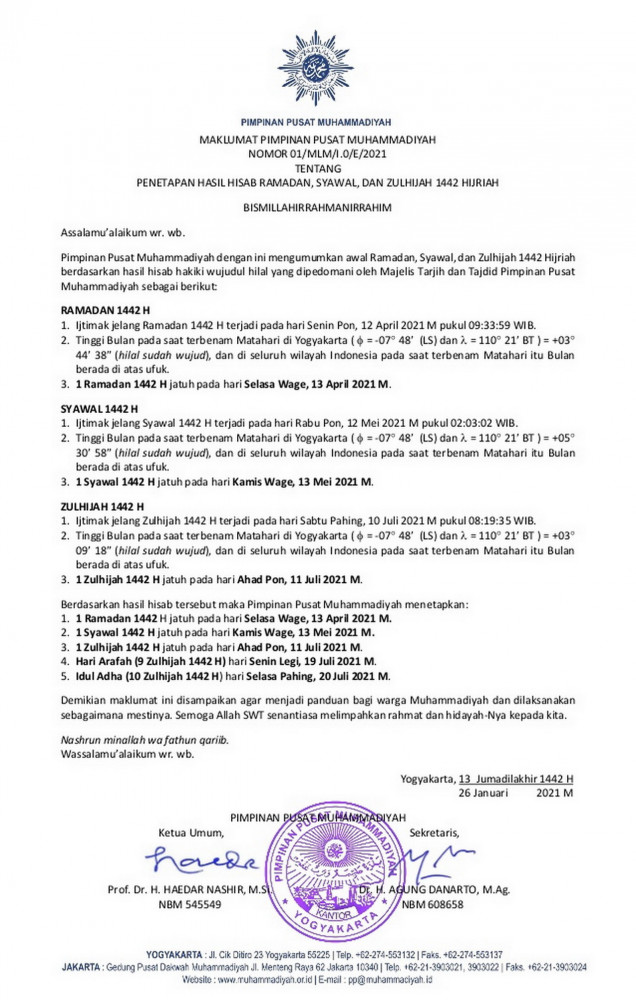Sebelumnya, Pimpinan Pusat (PP) Muhammadiyah menetapkan awal bulan puasa Ramadan 2021 atau 1 Ramadan jatuh pada hari Selasa Wage, 13 April 2021. Sementara perayaan Idulfitri 1 Syawal 1442 Hijriah jatuh pada hari Kamis Wage, 13 Mei 2021.