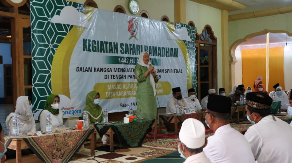 Bojonegoro - Bupati Bojonegoro Anna Muawanah, pada Rabu (14/04/2021) mengawali Safari Ramadan di Masjid Al Falah, Dusun Paloh, Desa Karangan, Kecamatan Kepohbaru, Kabupaten Bojonegoro.