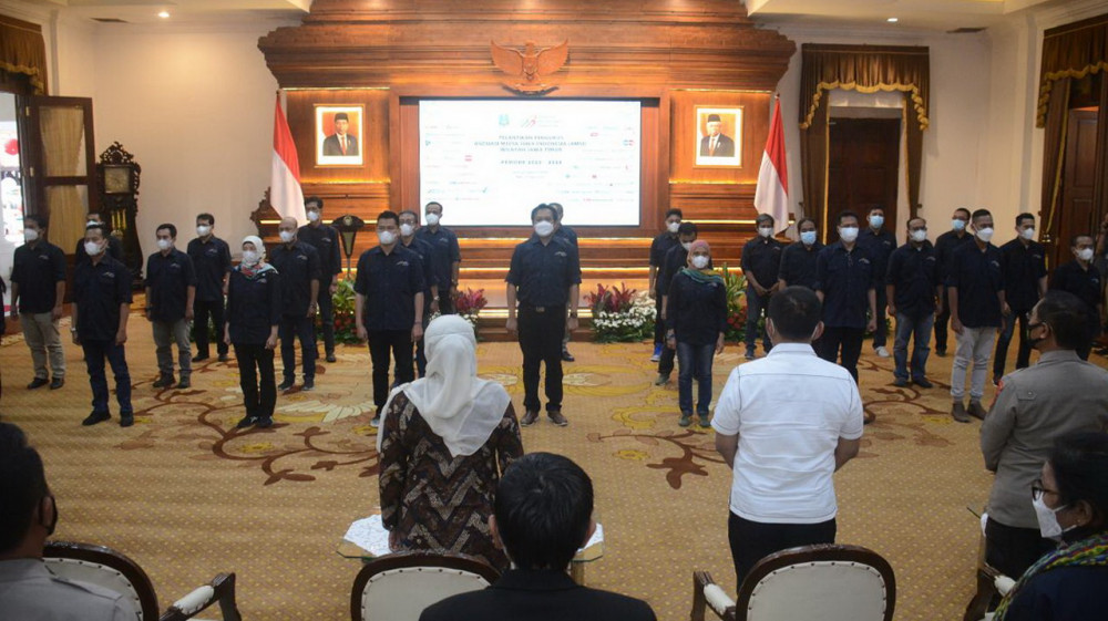 Surabaya - Gubernur Jawa Timur Khofifah Indar Parawansa melantik Pengurus Asosiasi Media Siber Indonesia (AMSI) Jatim periode 2020-2023, di Gedung Negara Grahadi, Rabu (21/04/2021).
