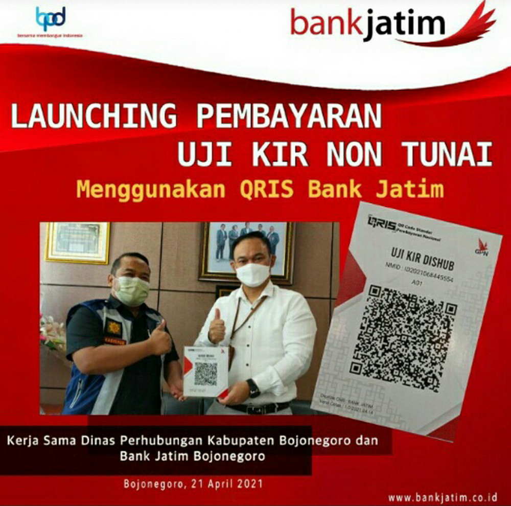 Bojonegoro - Dinas Perhubungan Pemerintah Kabupaten Bojonegoro bekerja sama dengan Bank Pembangunan Daerah Jawa Timur (Bank Jatim) terus mengembangkan inovasinya di bidang layanan digital, dalam mempermudah pembayaran uji kelaikan kendaraan niaga atau uji kir, secara non tunai.