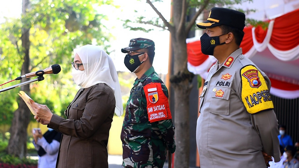 Apel dipimpin oleh Bupati Bojonegoro, Dr Hj Anna Muawanah didampingi Kapolres Bojonegoro, AKBP Eva Guna Pandia SIK MM MH, dan Dandim 0813 Bojonegoro, Letkol Inf Bambang Hariyanto,