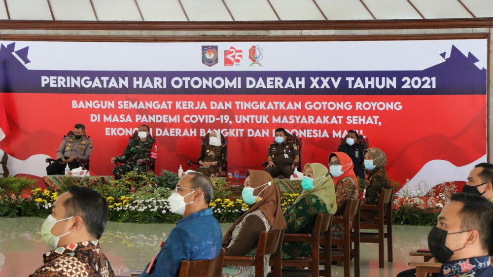 Bojonegoro - Bupati Bojonegoro Anna Muawanah bersama Forkopimda Bojonegoro, pada Senin (26/04/2021), bertempat di Pendopo Pemkab Bojonegoro, hadiri puncak acara Peringatan Hari Otonomi Daerah Tahun 2021 secara virtual.