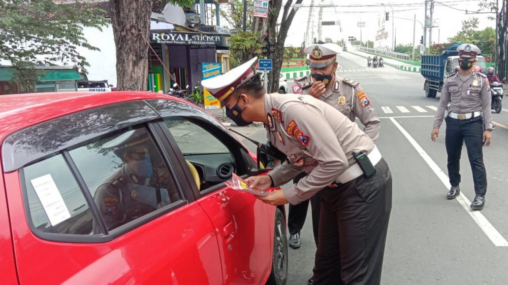 Kasat Lantas AKP Rizal Nugra Wijaya SIK saat laksanakan pembagian brosur larangan mudik kepada para pengguna jalan. (foto: Istimewa)