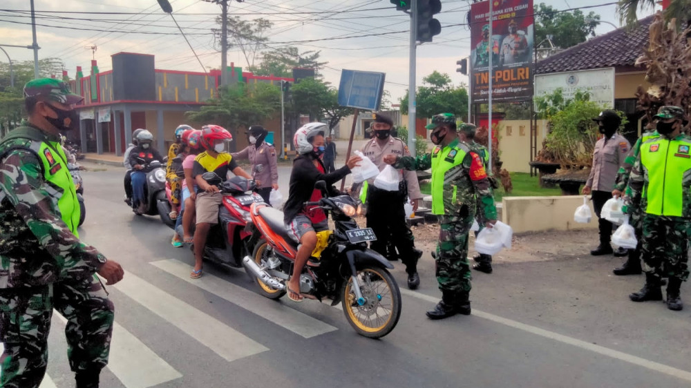 Anggota Kodim dan Polres Blora, saat bagikan takjil gratis kepada warga di depan Makodim Blora. Rabu (28/04/2021) (foto: Istimewa)