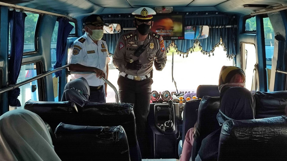 Petugas saat laksanakan sosialisasi larangan mudik lebaran kepada masyarakat di Terminal Rajekwesi Bojonegoro. (foto: Istimewa)
