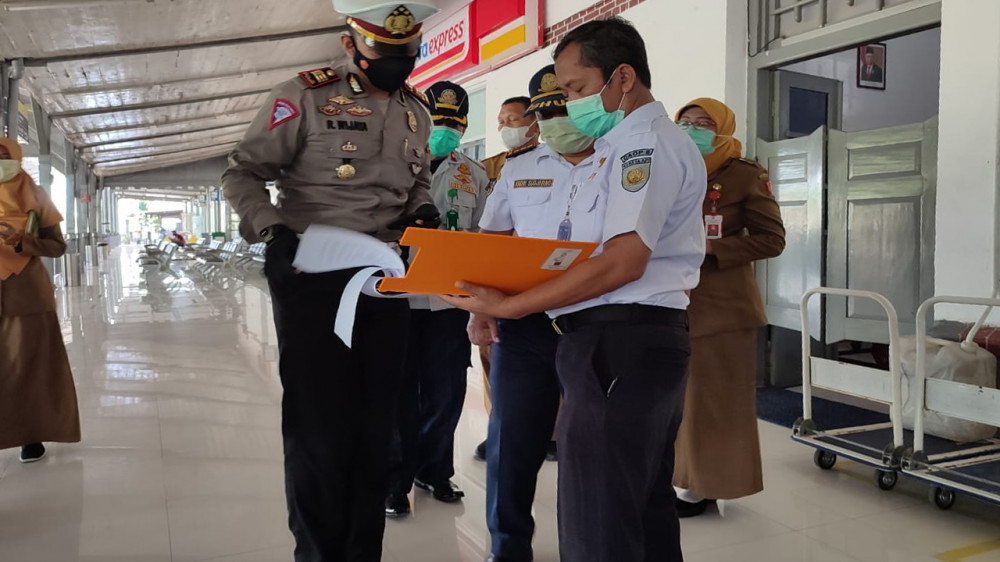 Kasat Lantas Polres Bojonegoro, Kepala Dishub dan Kepala Dinkes Kabupaten Bojonegoro, saat koordinasi dengan petugas Stasiun Kereta Api Bojonegoro, terkait larangan mudik lebaran. (foto: Istimewa)