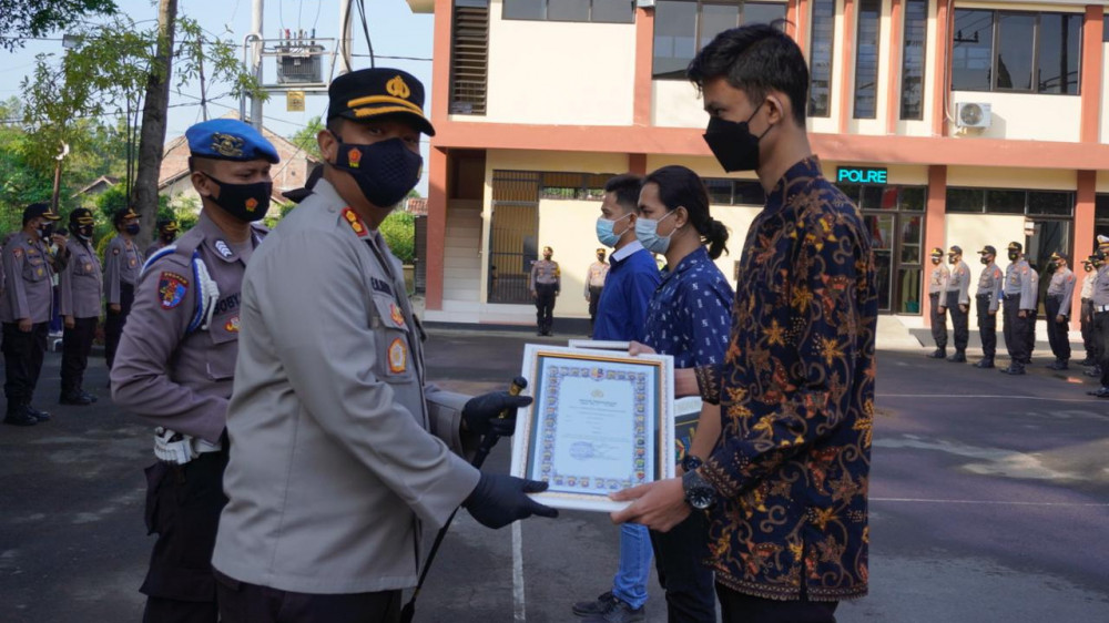 Bojonegoro - Kapolres Bojonegoro, AKBP EG Pandia, SIK, MM, MH, pada Senin (10/05/2021) bertempat di halaman Mapolres Bojonegoro, menyerahkan hadiah kepada para pemenang lomba TikTok dalam rangka imbuan larangan mudik lebaran tahun 2021.