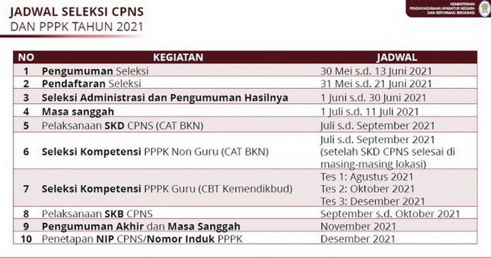Jadwal Seleksi CPNS dan PPPK Tahun 2021