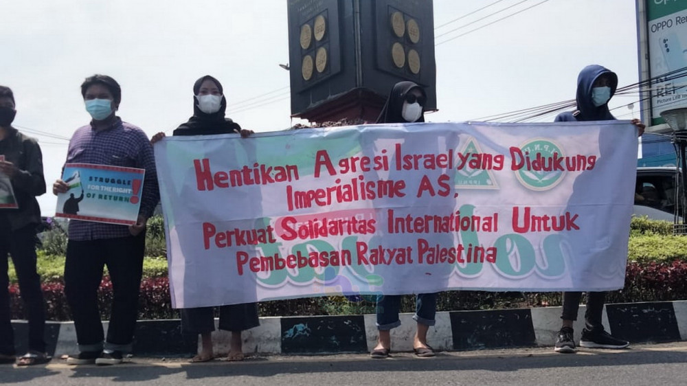 Dalam aksinya, para pemuda tersebut membawa poster dan membentangkan spanduk bertuliskan "Hentikan agresi Israel yang didukung Imperialisme AS. Perkuat solidaritas Internasional untuk pembebasan rakyat Palestina".