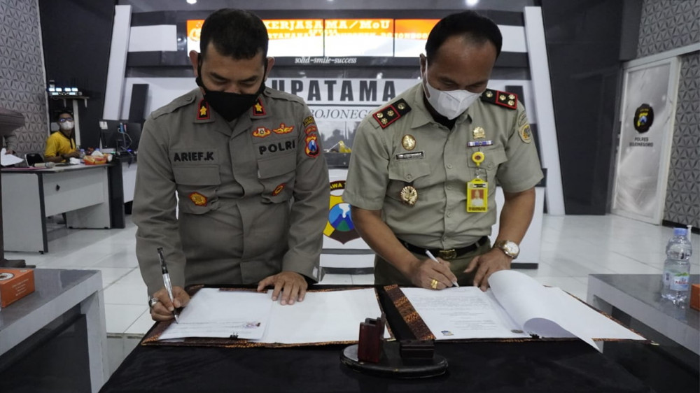 Bojonegoro - Sebagai upaya mempercepat sertifikasi asset dan pengumpul data yuridis (Puldadis) bagi Pendaftaran Tanah Sistematis Lengkap (PTSL) dan guna mencegah mafia tanah serta pungutan liar, Polres Bojonegoro, pada Kamis (10/06/2021), tanda tangani Memorandum of Understanding (MoU) dengan Kantor Pertanahan Kabupaten Bojonegoro.