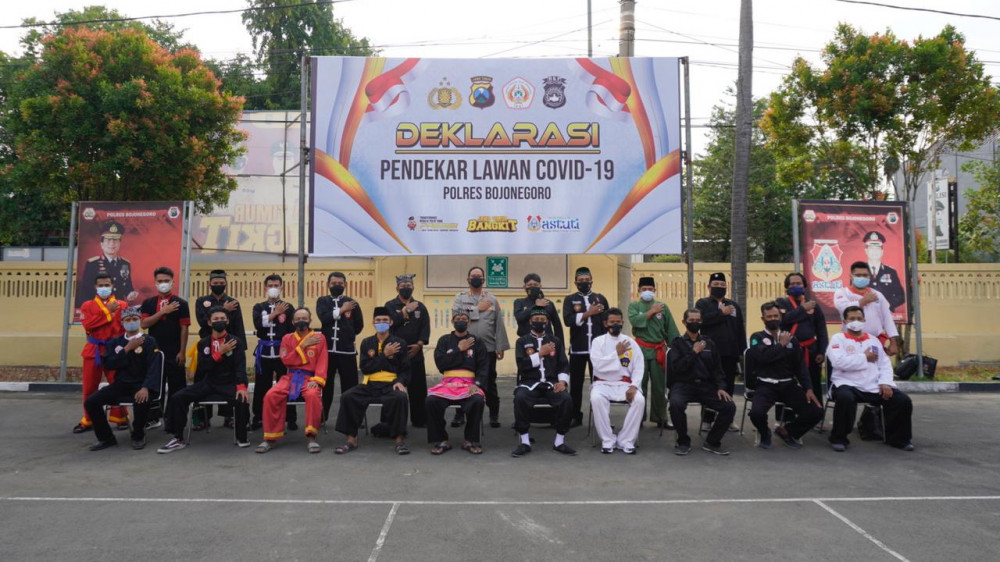 Bojonegoro - Jajaran Polres Bojonegoro, bersama perguruan pencak silat yang tergabung dalam komunitas Bojonegoro Kampung Pesilat (BKP), pada Jumat (18/06/2021), menggelar Deklarasi Pendekar Lawan COVID-19.