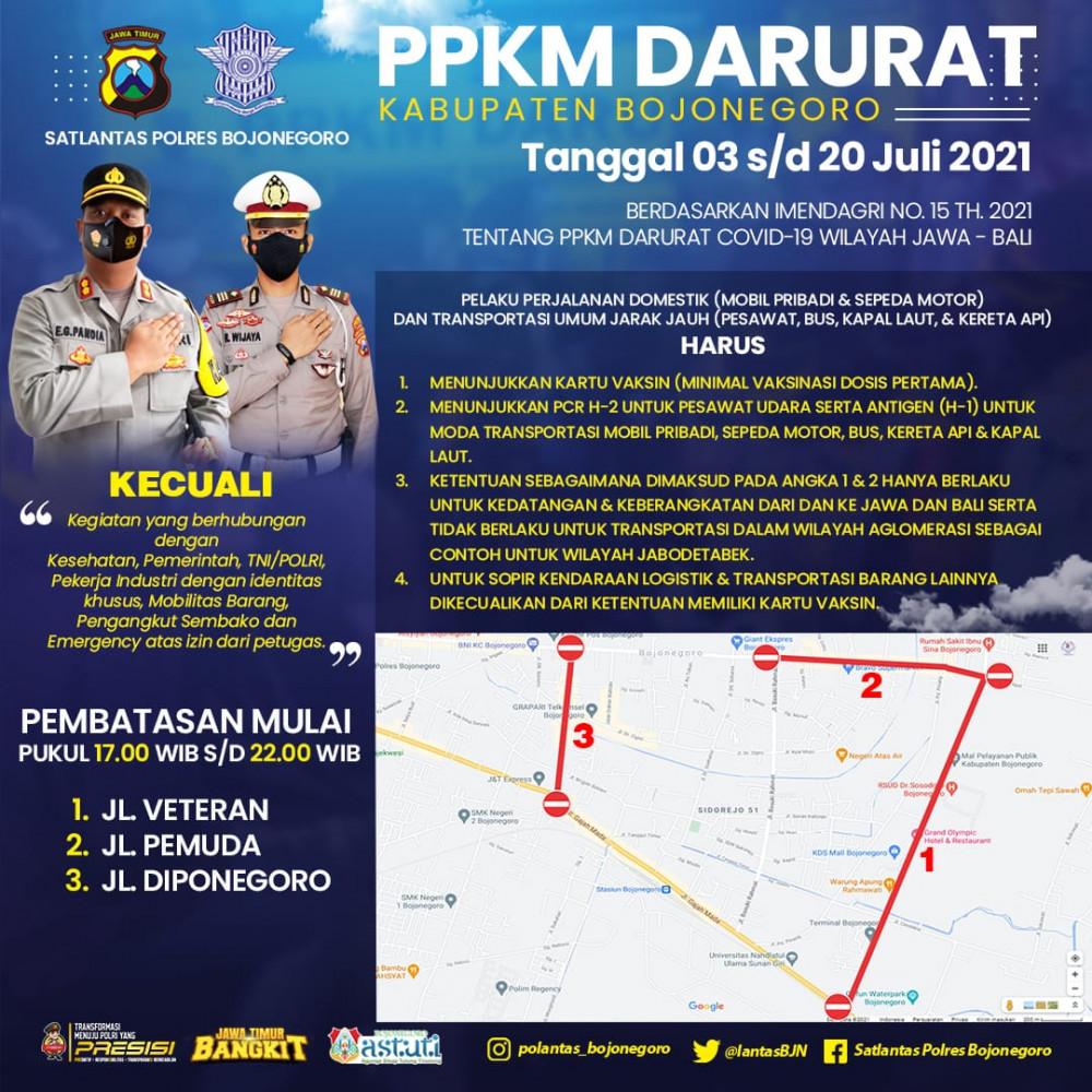 "Guna menindak lanjuti Instruksi Mendagri tersebut diberlakukan pembatasan mobilitas pada tiga ruas jalan di Kota Bojonegoro, antara lain Jalan Veteran, Jalan Pemuda, dan Jalan Diponegoro, mulai pukul 17.00 WIB sampai dengan pukul 22.00 WIB." kata AKP Rizal Nugra Wijaya. Rabu (07/07/2021)