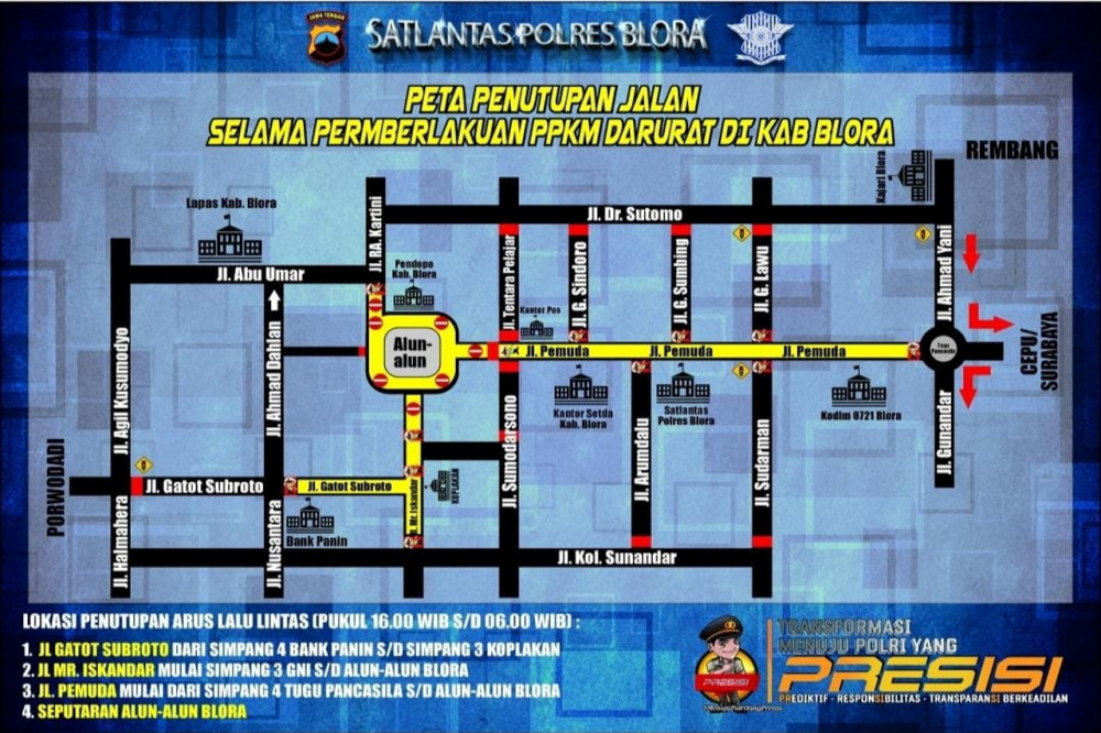 Sejumlah ruas jalan di Blora yang dilakukan penyekatan mulai pukul 16.00 WIB sampai dengam pukul 06.00 WIB, yaitu Jalan Gatot Subroto, Jalan Mr Iskandar, Jalan Pemuda, dan seputaran Alun-alun Blora. (istimewa)