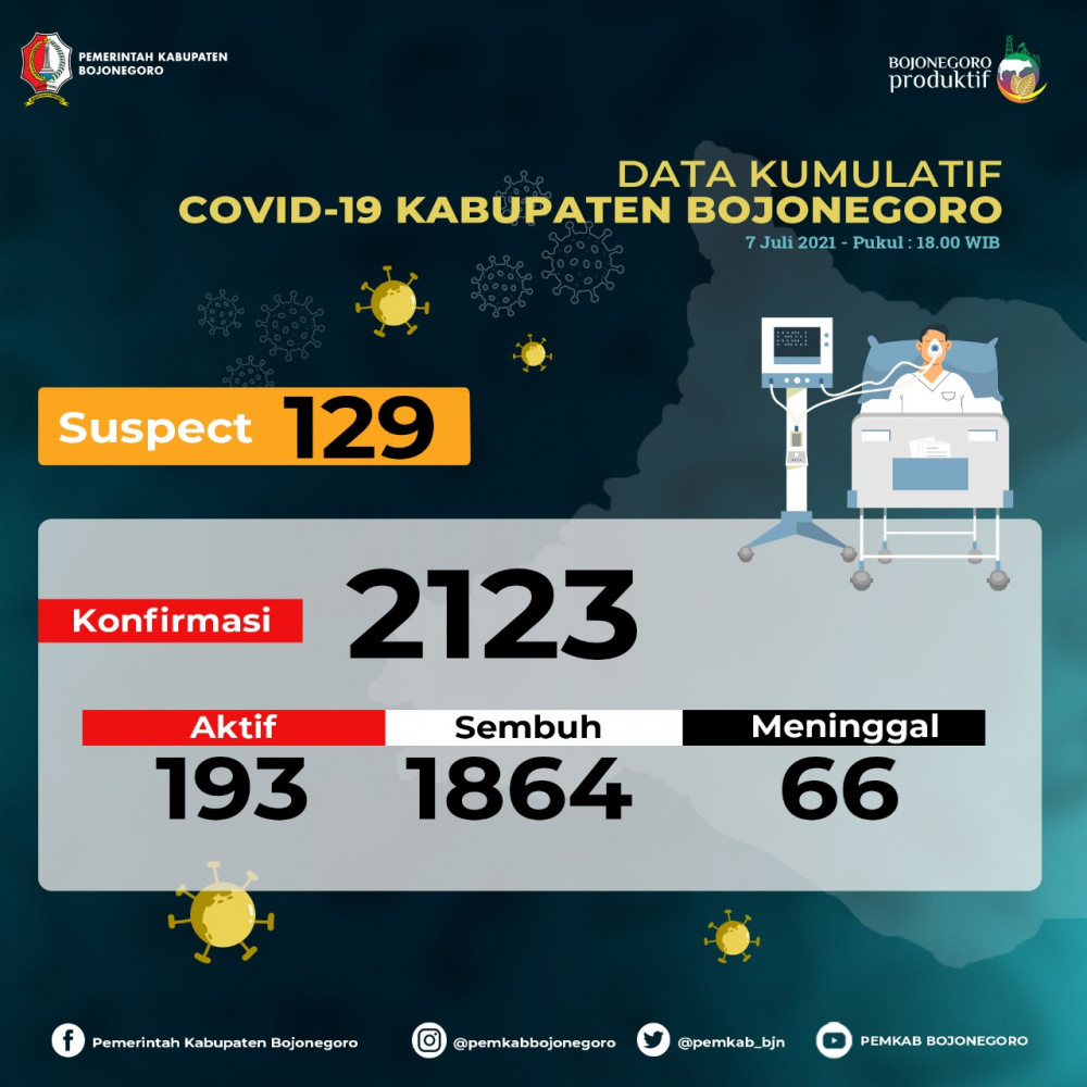 Data yang diterima media ini dari Juru Bicara Gugus Tugas Penanggulangan dan Percepatan Penanganan Virus Corona (COVID-19) Kabupaten Bojonegoro, Triguno Sujono Priyo SSTP MM melalui siaran pers disebutkan bahwa update sebaran COVID-19 di Kabupaten Bojonegoro per tanggal 07 Juli 2021, untuk kasus konfirmasi positif hari ini dinyatakan sembuh 30 orang, penambahan baru hari ini 98 orang, penambahan kasus meninggal dunia 4 orang.