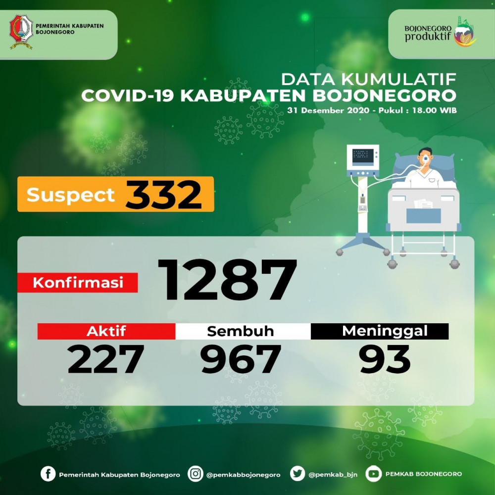 Untuk diketahui, sepanjang tahun 2020 atau sejak pertama kali kasus COVID-19 ditemukan pertama kali di Kabupaten Bojonegoro pada 11 April 2020 lalu, hingga 31 Desember 2020, jumlah kasus kumulaif positif COVID-19 di Kabupaten Bojonegoro mencapai sebanyak 1.287 orang, positif aktif (dirawat) 227 orang, sembuh 967 orang, dan meninggal 93 orang.