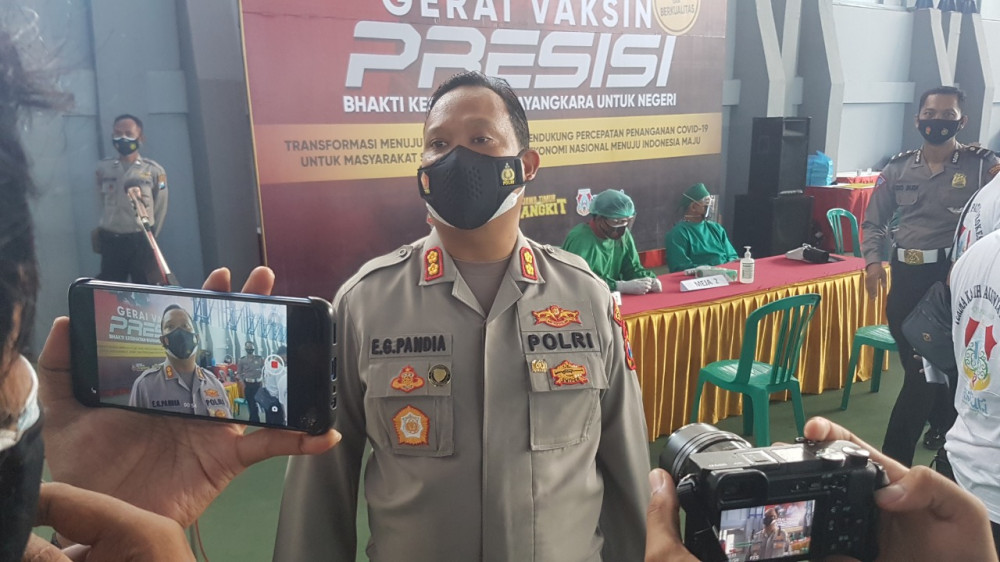 Kapolres AKBP EG Pandia saat beri keterangan di sela-sela pelaksanaan vaksinasi Corona di halaman Masjid Al-Ikhlas Polres Bojonegoro, Sabtu (10/07/2021). (istimewa)