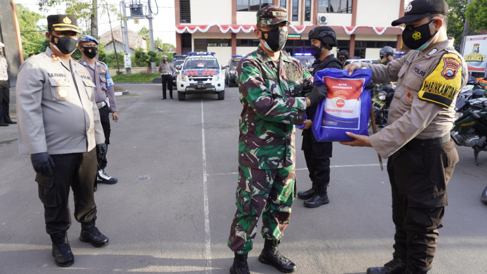 Bojonegoro - Kapolres Bojonegoro AKBP EG Pandia SIK MM MH bersama Dandim 0813 Bojonegoro Letkol. Inf. Bambang Hariyanto, pada Jumat (16/7/2021) sore, salurkan bantuan sosial (Bansos) berupa paket beras kepada masyarakat terdampak pandemi COVID-19 di tengah Pemberlakuan Pembatasan Kegiatan Masyarakat (PPKM) Darurat, di Kabupaten Bojonegoro.