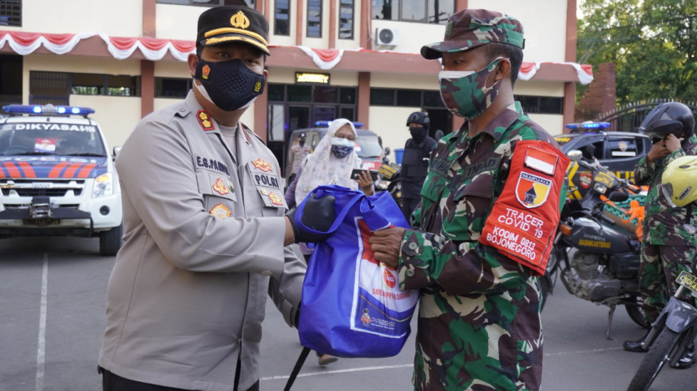 Kapolres Bojonegoro, AKBP EG Pandia menyampaikan bahwa hari ini Polres Bojonegoro bersama Kodim 0813 Bojonegoro melakukan bakti sosial kepada masyarakat yang terdampak COVID-19.