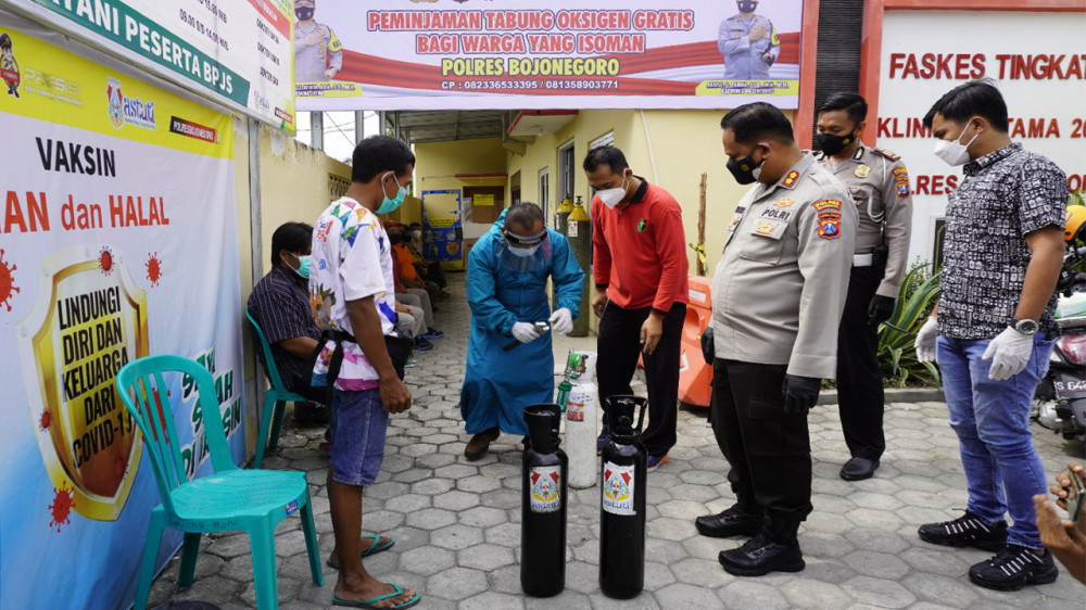 Guna mengantisipasi hal tersebut, Kepolisian Resor (Polres) Bojonegoro menginisiasi program peminjaman tabung oksigen gratis bagi pasien COVID-19 yang sedang menjalali isolasi mandiri (Isoman).