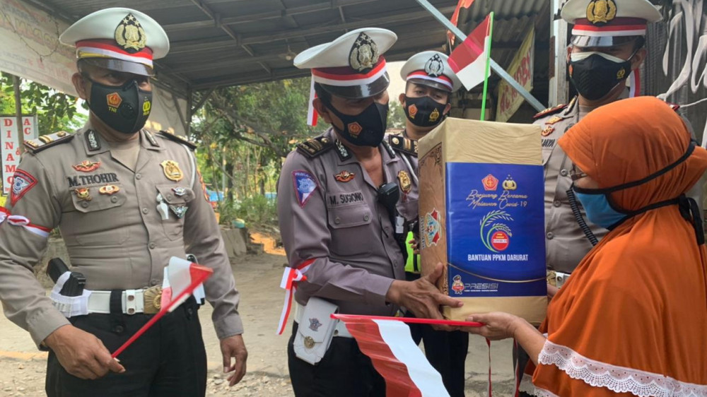Kasat Lantas Polres Bojonegoro, AKP Rizal Nugra Wijaya menyampaikan, bahwa pemberian bantuan paket sembako sebagai bentuk kepedulian Polri kepada masyarakat yang perekonomiannya menurun di tengah pandemi COVID-19 dan PPKM Level 4.