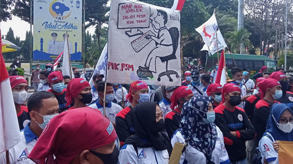 Terkait tuntutan buruh, Wadiono menyampaikan, bahwa surat masuk pada 23 Juni 2021 dan disposisi pada tanggal 29 Juni 2021. Dan pada tanggal 6 Juli 2021 surat sudah diproses, kemudian pada tanggal 7 Juli 2021 suratnya sudah ditandatangani kepala dinas.