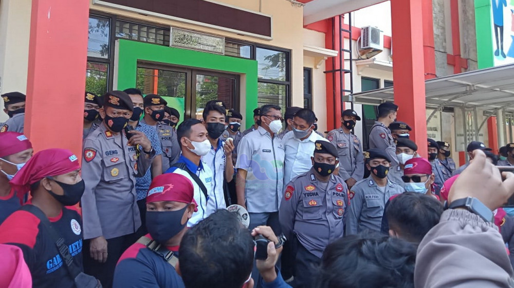 "Pertama saya sampaikan permintaan maaf dan kedua permohonan maaf dari kepala dinas yang belum bisa menemui, karena ada tamu dari pusat," ucap Wadiono di depan massa aksi.