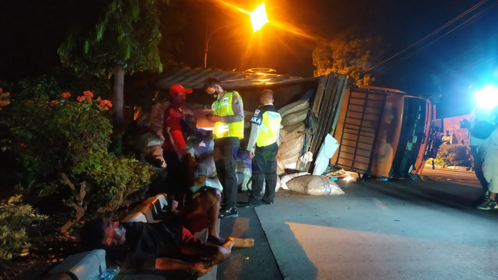 "Saat jalan menurun kemudi kendaraan oleng ke kiri dan tidak dapat kendalikan pengemudinya sehingga truk mengalami selip dan terguling ke kanan." kata Ipda Eko Sulistyono.