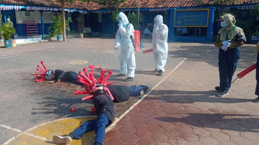 Sementara itu, ketika teatrikal dilakukan, terlihat anak-anak memainkan peran satu sama lain, ada yang memerankan sebagai virus Corona, tim medis, petugas penyemprot disinfektan, hingga siswa yang tidak memakai masker.