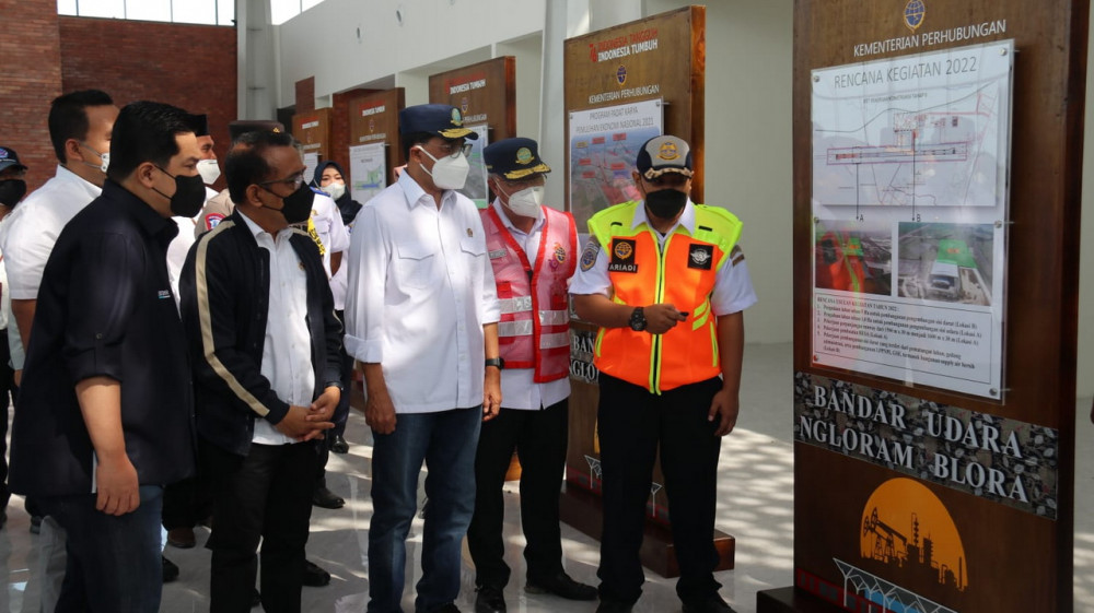 Sesampainya di bandara, tiga menteri langsung meninjau progres proyek pembangunan Bandara Ngloram di Cepu, yang ditargetkan akan beroperasi di akhir tahun 2021.