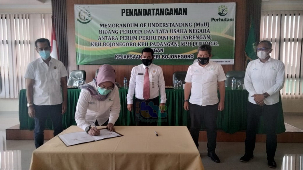 Bojonegoro - Kejaksaan Negeri (Kejari) Bojonegoro pada Kamis (02/09/20210 lakukan penandatangan nota kesepahaman atau Memorandum of Understanding (MoU) Bidang Perdata dan Tata Usaha Negara, dengan Perum Perhutani di 4 wilayah, yaitu Perhutani Kesatuan Pemangkuan Hutan (KPH) Bojonegoro, KPH Parengan, KPH Pandangan, dan KPH Jatirogo.