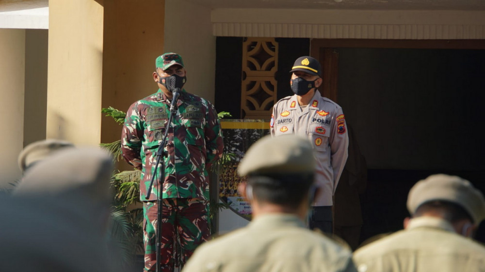 Dandim 0721 Blora Letkol Inf Andy Soelistyo Kurniawan Putro saat beri sambutan dalam apel bersama anggota Satpol PP, di halaman Kantor Sekretariat Pemkab Blora. Selasa (07/09/2021). (istimewa)