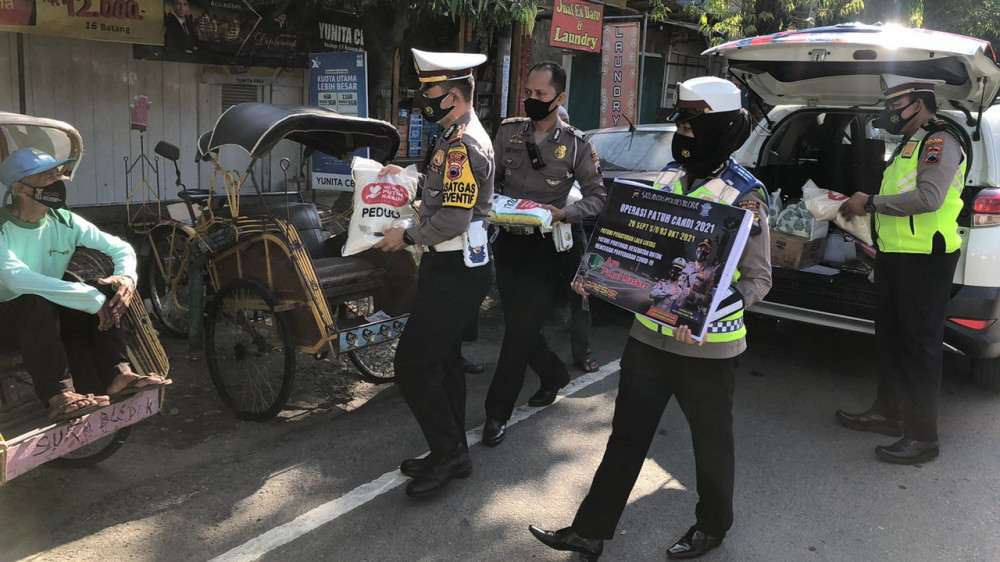 "Kegiatan sosial terus kita lakukan, baik pembagian masker ataupun paket sembako kepada masyarakat yang membutuhkan. Dan dalam patroli mobiling kali ini, kita bagi dua tim. Total hari ini kita bagikan 50 paket sembako di lokasi berbeda," kata Kasat Lantas AKP Edi Sukamto.