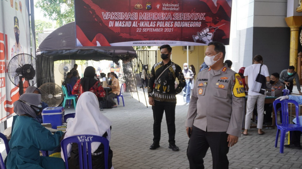 "Kita ingin mendorong agar vaksinasi ini bisa dipercepat sehingga bisa tercapai kekebalan komunal sehingga kita bisa terhindar dari COVID-19,” ucap Kapolres Bojonegoro saat meninjau acara vaksinasi di halaman Masjid Al-Ikhlas Polres Bojonegoro, Kamis (23/09/2021).