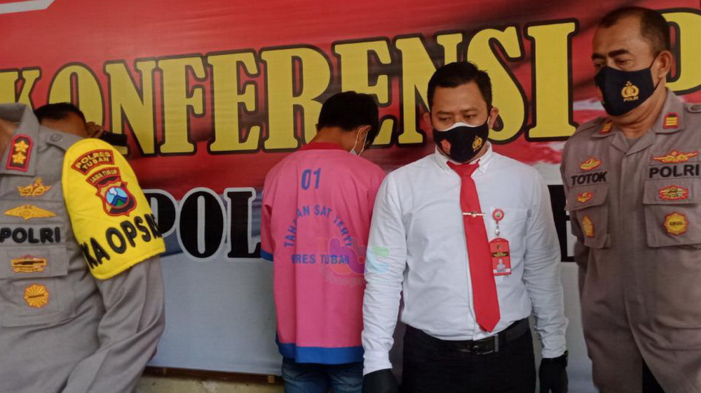 Tersangka IS (35) warga Desa Simorejo, Kecamatan Widang, Kabupaten Tuban, saat deihadirkan dalam konferensi pers di Mapolres Tuban, Senin (27/09/2021). (foto: ayu/beritabojonegoro)