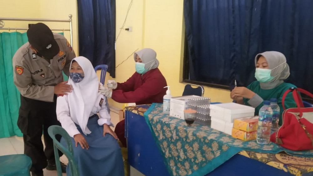 Bojonegoro - Polsek Sumberrejo, Polres Bojonegoro, pada Selasa (28/09/2021) kembali menggelar vaksinasi corona bagi pelajar Sekolah Menengah Atas (SMA) Negeri 1 Sumberrejo dan santri di Pondok Pesantren (Ponpes) Dungmas, di Desa Kedungrejo, Kecamatan Sumberrejo.