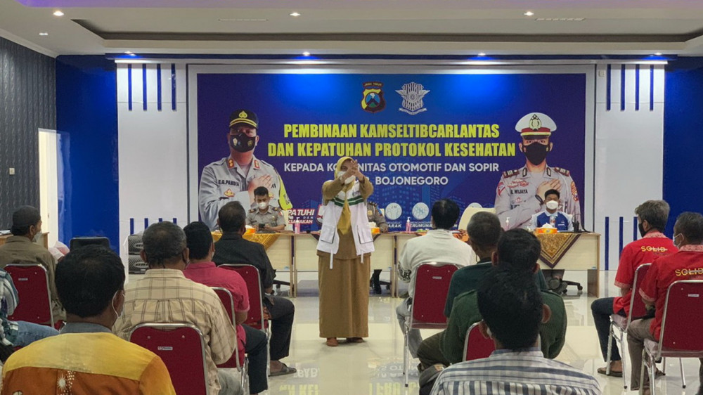 Acara pembinaan Kamseltibcar Lantas dan kepatuhan protokol kesehatan, kepada komunitas otomotif dan sopir yang digelar Sat Lantas Polres Bojonegoro. (foto: Dok istimewa)