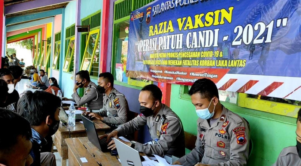 AKP Edi juga menjelaskan, pengemudi kendaraan bermotor yang belum memiliki kartu vaksin dan belum melakukan vaksin, mereka langsung diarahkan untuk melaksanakan kegiatan vaksin di SD Turirejo Jepon.