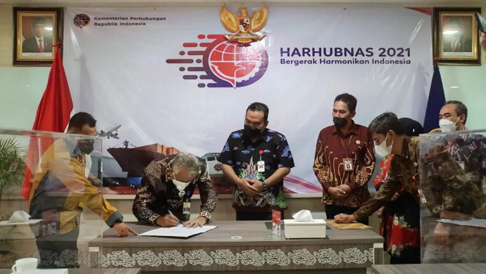 Bupati Blora bersama Sekretaris Direktorat Jendral (Sesditjen) Perhubungan Udara, saat tandatangani berita acara penyerahan sertifikat tanah perluasan lahan Bandara Ngloram Blora. (foto: Dok Istimewa)