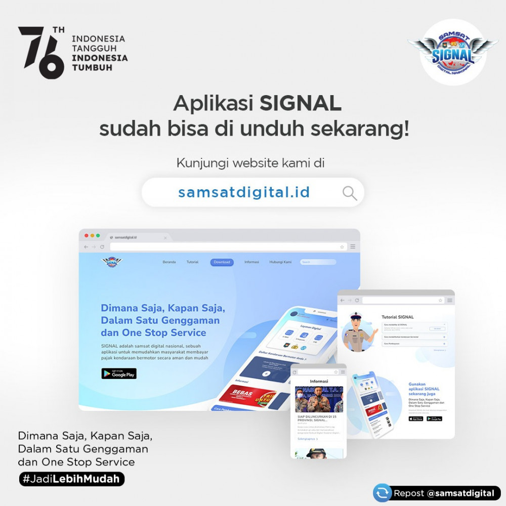 AKP Rizal Nugra Wijaya menambahkan bahwa untuk memanfaatkan Aplikasi Signal ini sangat mudah, yakni masyarakat dapat mengakses dengan cara mengunduh aplikasi Samsat Digital Nasional di Google Play Store pada platform android dengan kata kunci “Samsat Digital Nasional’ atau cukup melalui link/tautan