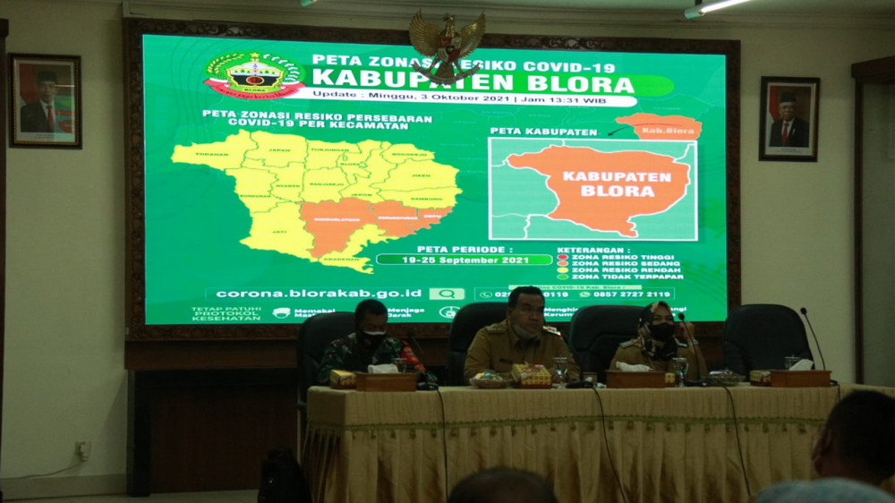 Blora - Perkembangan pandemi COVID-19 di Kabupaten Blora terus dikawal Bupati H Arief Rohman SIP MSi. Hal ini agar status Blora bisa segera turun ke Pemberlakuaan Pembatasan Kegiatan Masyarakat (PPKM) Level I.